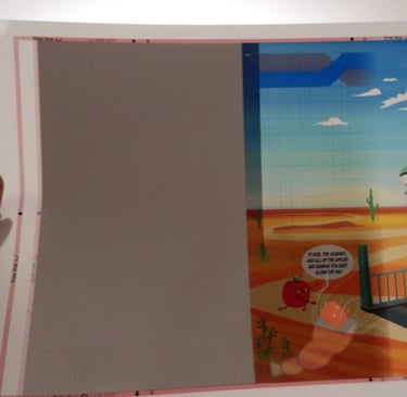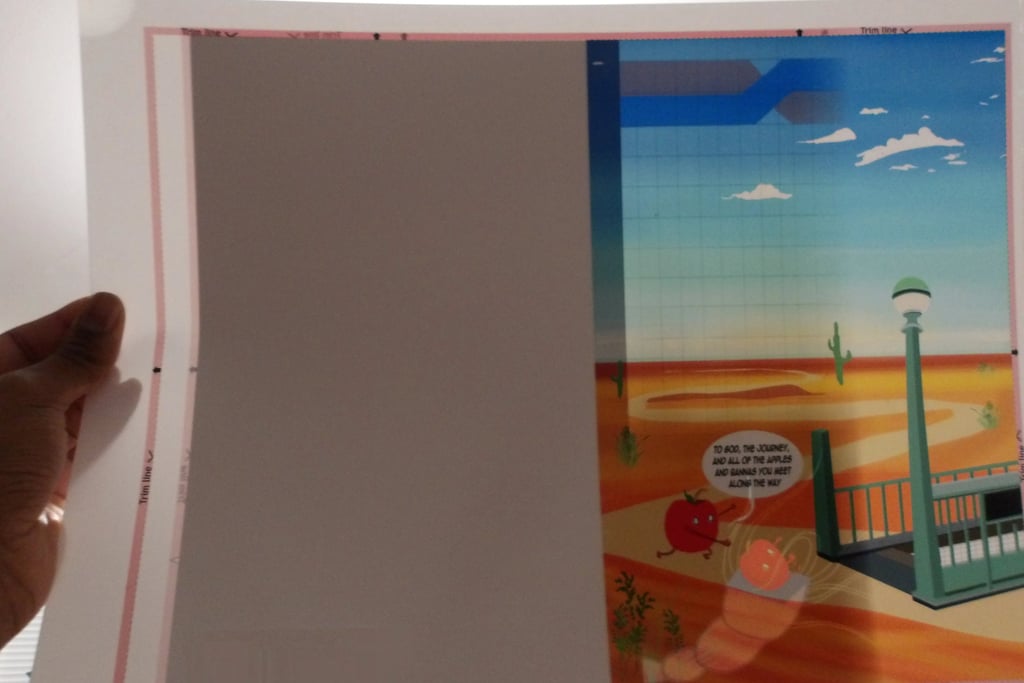 Visual depicting how the pink trim lines were not lining up. Which, in turn would make trimming the pages accurately impossible.