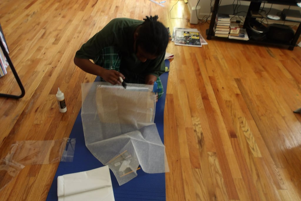 The artist turned bookbinder adheres the muslin to the spine using PH neutral glue, an action to be followed up by gluing the archival tissue paper on top to further secure the signatures.