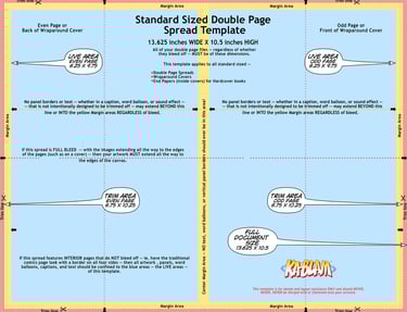 What was causing this I pondered? After careful consideration I recalled something I learned in the beginning of my comics journey but admittedly always kinda brushed off: my bleeds. While preparing my files for print on my computer, I neglected to set up my pages more carefully so that they were abiding by the standards set by Ka-Blams double page spread template as shown below.