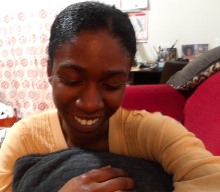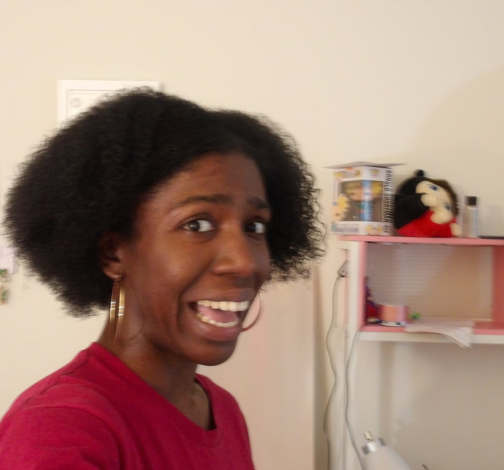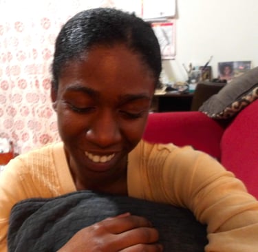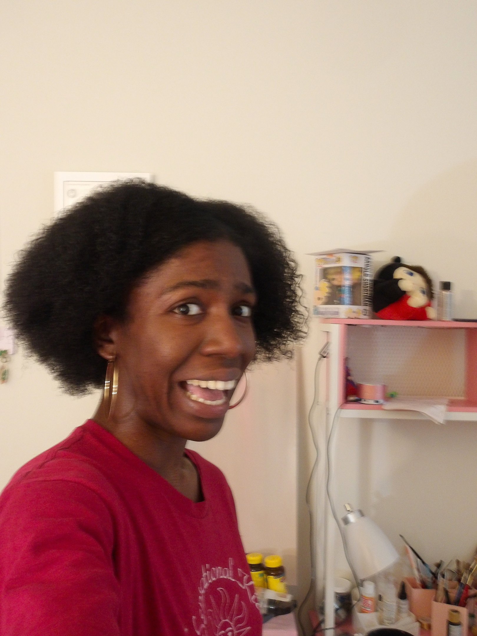 The artist smiling as she contemplates all the things that she is excited about, and all the things that she's had to overcome to get to this point.