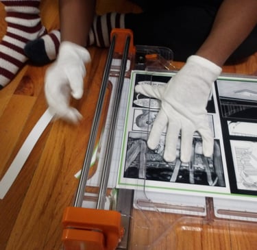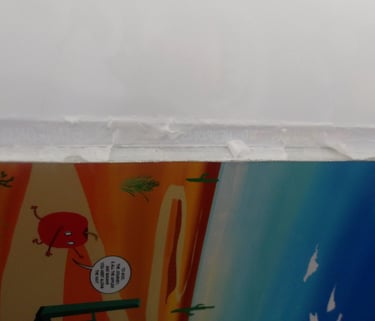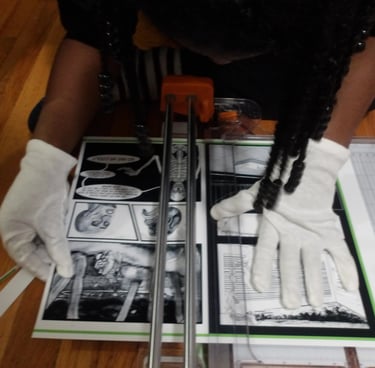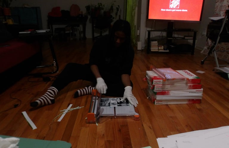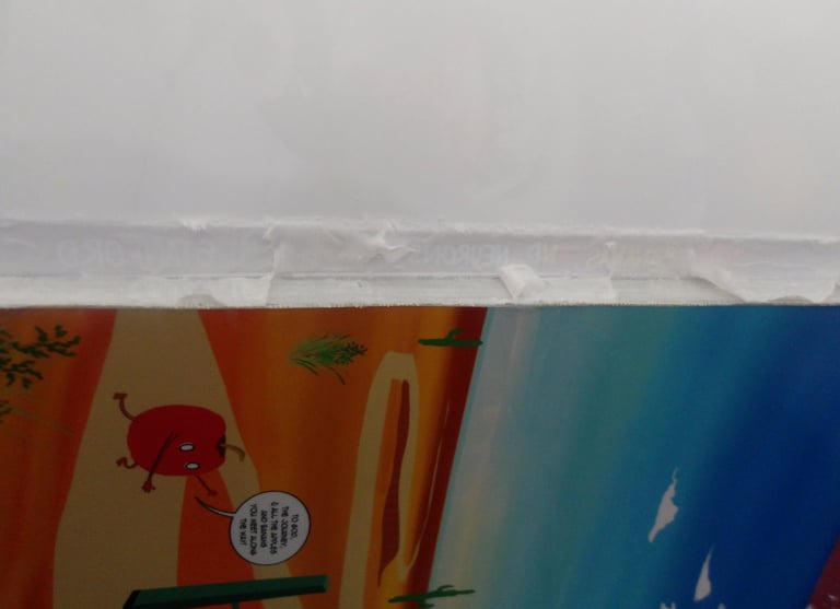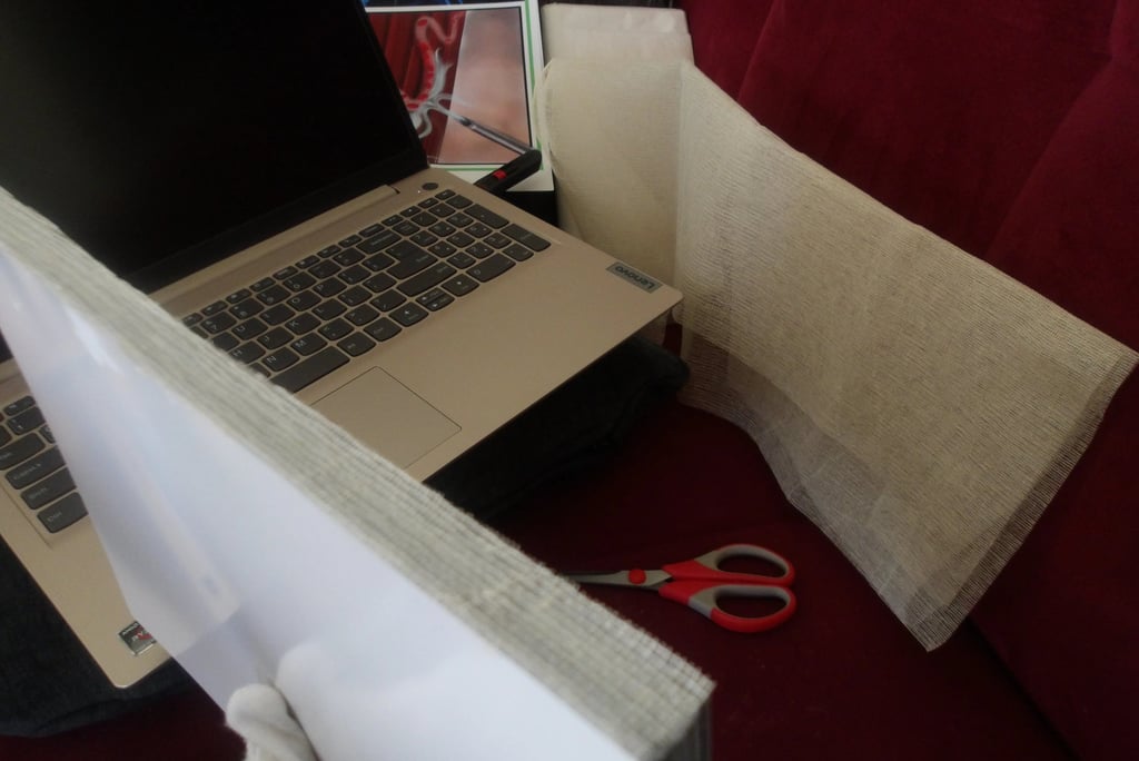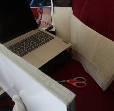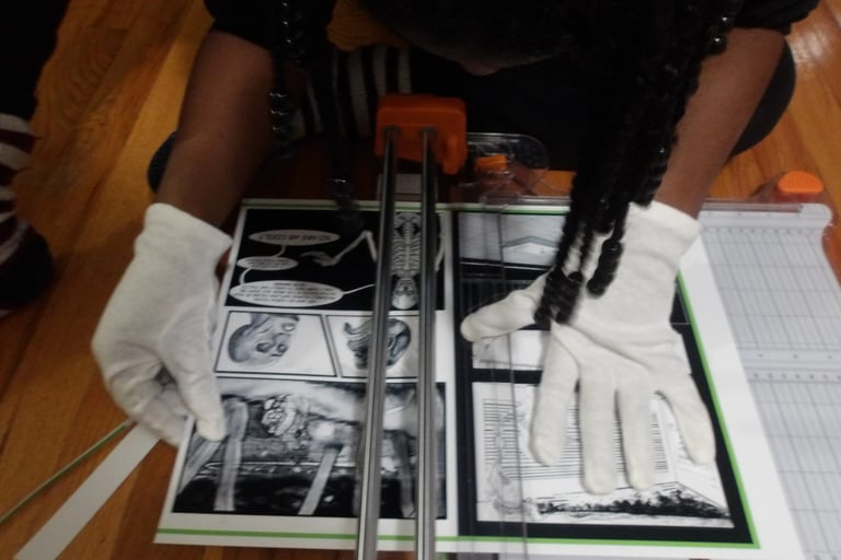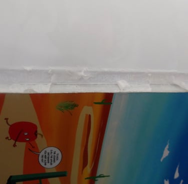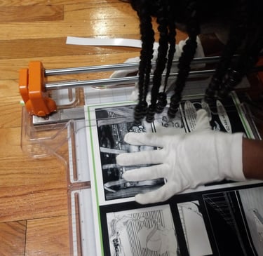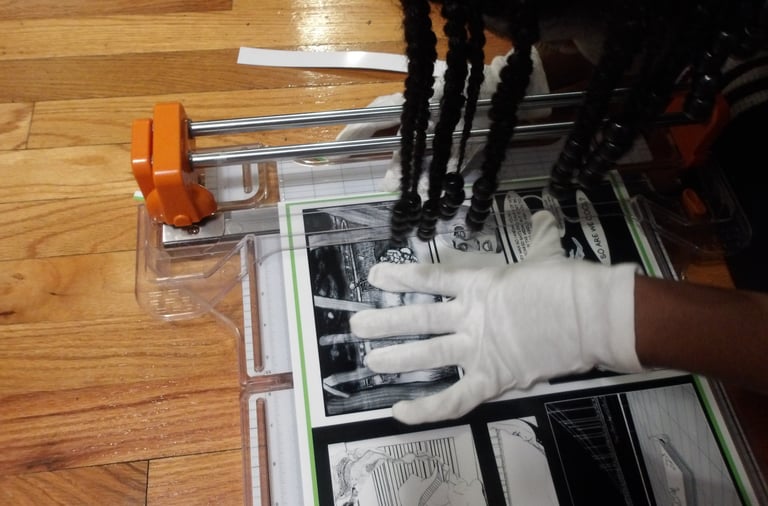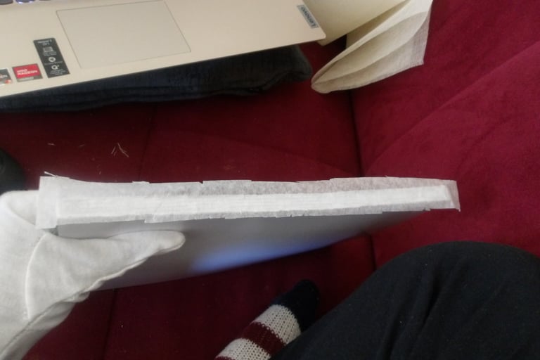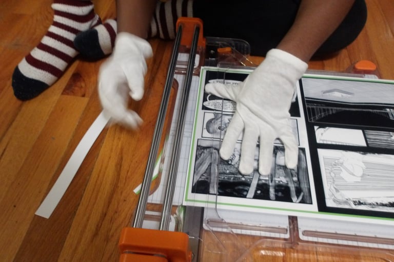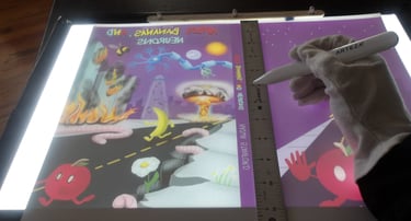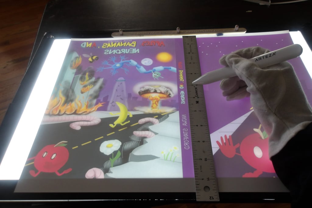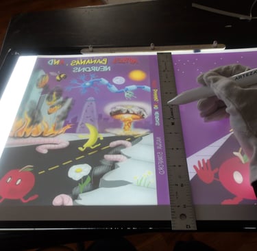 After scoring the spine, it was then time to attach the cover to the signature. Here came my next problem. The cover was way too large for the signature. Now, this is completely baffling to me. I've measured the perimeter of the signature multiple times; I then adjusted the size of the cover accordingly several times in Krita, and yet, the size of the cover was still too large. I am still troubleshooting this, because as it stands right now I end up chopping off important details, like a part of the Apple's arm which is truly not what I want to do.