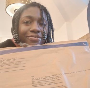 So, we've done it gang! My little graphic novel has FINALLY been sent off to the Copyright Office and shipped off with 2 day shipping! Why the rush you ask? Well, I can't print any more books until I can officially add the copyright page to my book--I realized this in the middle of printing my second--official copy. You see, so far I have printed four books, all to varying degrees of faultlessness, I'll show you what I mean later....but oops kind of went on off on a tangent there lets head back to our main point of today's discussion--therefore, I threw my long coat over my glue stricken pajamas, hopped in a cab, and sent off my stuff to the Copyright Office!